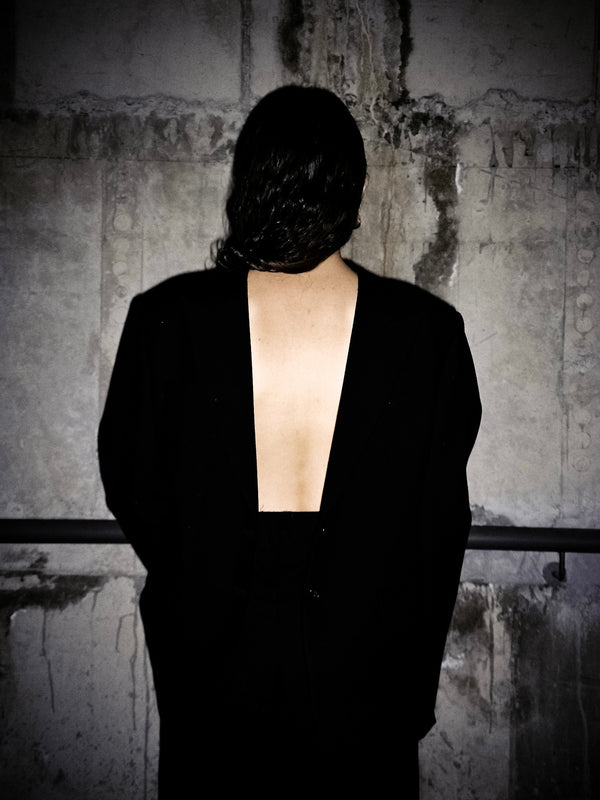 THAT IS TO PONDER, WHAT BECOMES OF OUR HAND TAILORED BESPOKE CASHMERE SUIT WHEN PHOTOGRAPHED IN A BRUTALIST BASEMENT, STYLED WITH BLACK LEATHER STILETTO HEELS AND DARINGLY LAYERED WITHOUT AN UNDERSHIRT BY OUR HOUSE MUSE MS AMY CLAIRE ARTHUR?